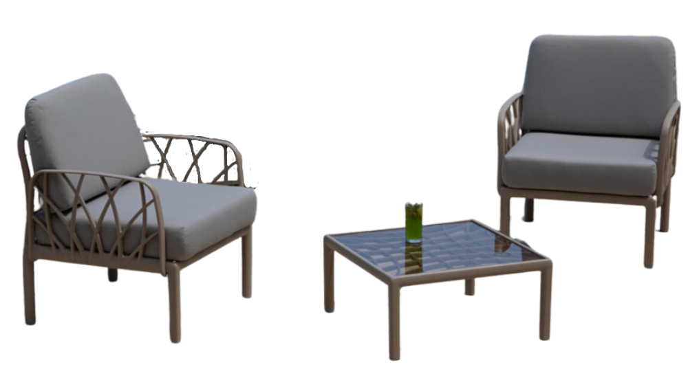 Komplet składa się z 2 wygodnych foteli i stolika kawowego ze szklanym blatem. Zestaw wyprodukowano z największą starannością, przy wykorzystaniu najlepszej jakości tworzywa sztucznego – polipropylenu wzmocnionego włóknem szklanym, co gwarantuje ekstremalną wytrzymałość i odporność na: deszcz, wilgoć, niskie temperatury, wiatr. Meble są antystatyczne, antyoksydacyjne, odporne na promieniowanie UV. Zestaw nie wymaga także pielęgnacji, a do jego wyczyszczenia wystarczy woda.